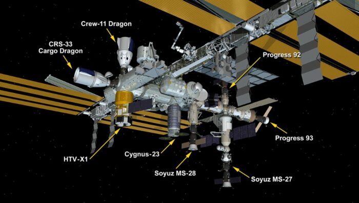 Оставшиеся пять кораблей на МКС — это российские автоматические грузовые корабли «Прогресс М-92» и «Прогресс М-93», которые находятся у российских модулей «Поиск» и «Звезда» соответственно; японский грузовой корабль HTV-X1, пристыкованный к порту модуля «Гармония» (узел 2); и две капсулы Dragon компании SpaceX.